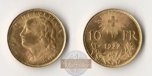 SCHWEIZ, föd. Bundesrepublik seit 1848. 10 Franken 1922 B "Vreneli". 2,9 gr. Feingold