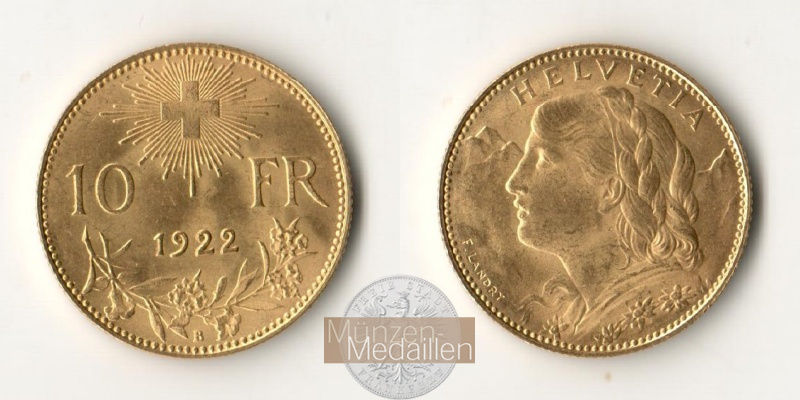 SCHWEIZ, föd. Bundesrepublik seit 1848. 10 Franken 1922 B "Vreneli". 2,9 gr. Feingold