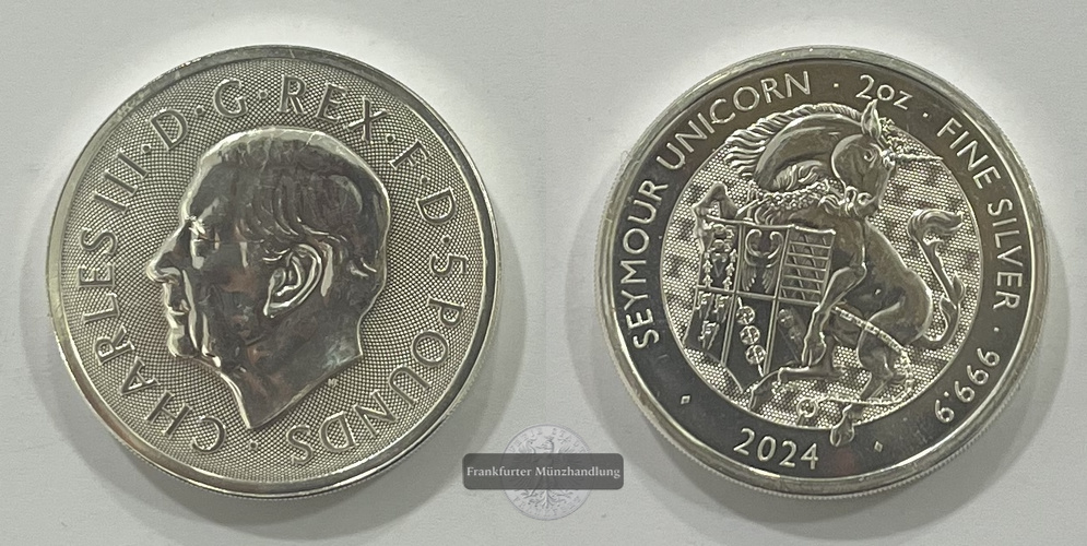 GROßBRITANNIEN. Tudor-Bestien Seymour Einhorn 2024, 5 Pfund FM-Frankfurt, Feinsilber: 62,2g