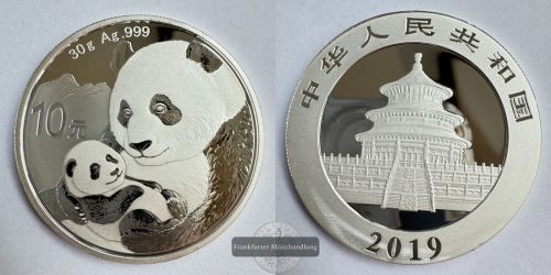 CHINA. Panda 10 Yuan Prägejahr: 2019 Gewicht: 30 g Material: 999/1.000 Silber Erhaltung: vzgl. in Kapsel (siehe Bild) UC#213 Die Ware ist differenzbesteuert nach §25a U...
