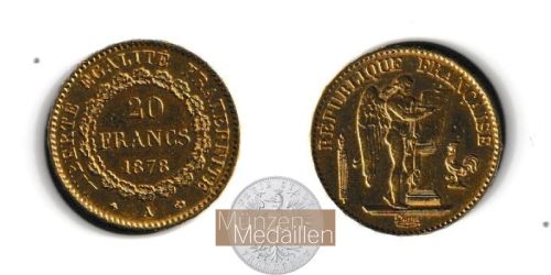 FRANKREICH. 3. Republik 1871-1940. 20 Francs 1878 "Genius" Münzstätte A = Paris Gewicht: 6,45gr. Material: 900/1.000 Gold Feingewicht: 5,81gr. Auflage: 9.189.000 Exem...