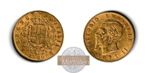 ITALIEN, Königreich. Vittorio Emanuele II. 1861-1878 20 Lire 1873 M - Münzstätte Mailand Gewicht: 6,45g Material: 900/1.000 Gold Feingewicht: 5,81g Erhaltung: sehr schö...