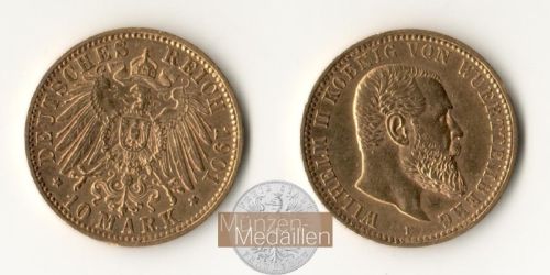 DEUTSCHES KAISERREICH. Württemberg, Wilhelm II. 1891-1918 10 Mark 1901 F - Münzstätte Stuttgart Gewicht: 3,99g Material: 900/1.000 Gold Feingewicht: 3,58g Erhaltung: sehr ...