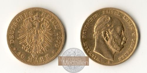DEUTSCHES KAISERREICH. Preussen, Wilhelm I. Kaiser 1871-1888 10 Mark 1874 A - Münzstätte Berlin Gewicht: 3,99g Material: 900/1.000 Gold Feingewicht: 3,58g Erhaltung: sehr sch&o...