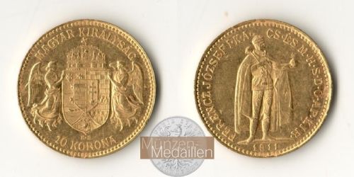 UNGARN, Franz Joseph I. König 1848-1918. 10 Kronen/Korona 1911 KB Münzstätte KB = Kremnitz Gewicht: 3,23g Material: 900/1.000 Gold Feingewicht: 3,05g Auflage:1.828.000 Exe...