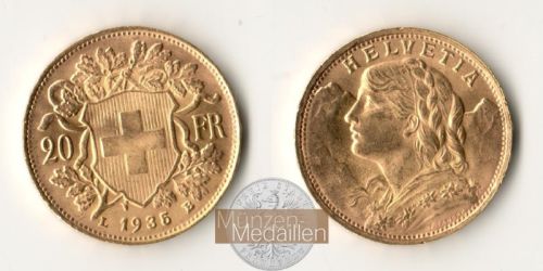SCHWEIZ, föd. Bundesrepublik seit 1848 20 Franken L 1935 B (Bern) "Vreneli" Gewicht: 6,45g Material: 900/1.000 Gold Feingewicht: 5,81g Erhaltung: sehr schön, winz. Rdf...