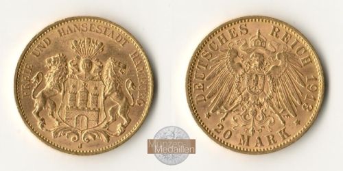 DEUTSCHES KAISERREICH. Hamburg, Freie und Hansestadt 1871-1918 20 Mark 1913 J - Münzstätte Hamburg Gewicht: 7,98g Material: 900/1.000 Gold Feingewicht: 7,17g Erhaltung: vorz&uu...