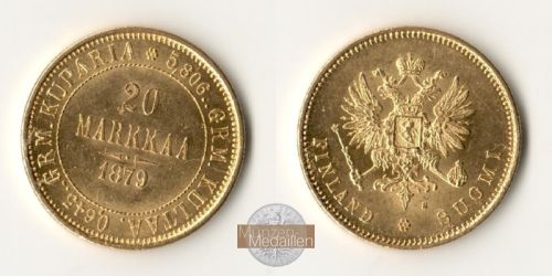 FINNLAND, unter russischer Besatzung, Zar Alexander II., 1864-1880 20 Markkaa 1879 S - Helsinki Gewicht: 6,45g Material: 999/1.000 Gold Feingewicht: 5,81g Erhaltung: vorzüglich A...
