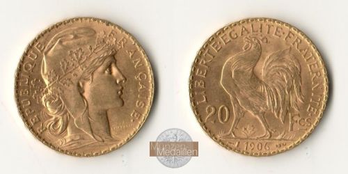 FRANKREICH. 3. Republik 1871-1940. 20 Francs 1906 Münzstätte A = Paris Gewicht: 6,45gr. Material: 900/1.000 Gold Feingewicht: 5,81gr. Auflage: 14.613.000 Exemplare Erhaltung...