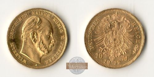 DEUTSCHES KAISERREICH. Preussen, Wilhelm I. Kaiser 1871-1888 10 Mark 1872 A - Münzstätte Berlin Gewicht: 3,99g Material: 900/1.000 Gold Feingewicht: 3,58g Erhaltung: vorzü...