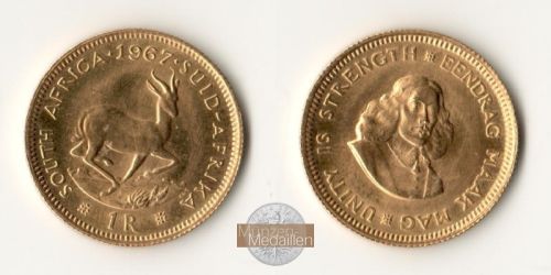 SÜDAFRIKA, Republik seit 1961 1 Rand 1967 (Pretoria) Gewicht: 3,99g Material: 917/1.000 Gold Feingewicht: 3,66g Erhaltung: vorzüglich Auflage: 10.000 Exemplare Zitat: KM#6...