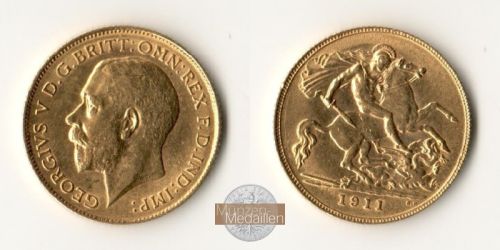 GROSSBRITANNIEN Georg V. 1910-1936 1/2 Sovereign 1911 (London) Gewicht: 3,99g Material: 917/1.000 Gold Feingewicht: 3,66g Erhaltung: sehr schön Auflage: 6.104.106 Exemplare Zi...