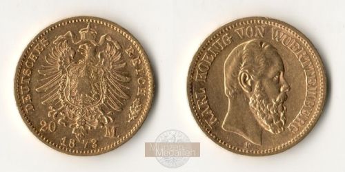 DEUTSCHES KAISERREICH. Württemberg, Karl-1871- 1891 20 Mark 1873 F - Münzstätte Stuttgart Gewicht: 7,98g Material: 900/1.000 Gold Feingewicht: 7,16g Erhaltung: sehr sch&ou...
