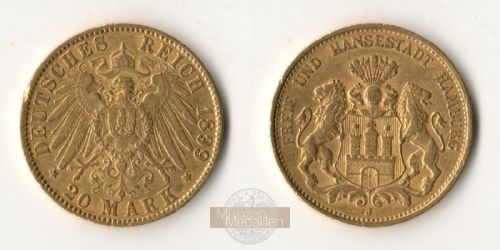 DEUTSCHES KAISERREICH. Hamburg, Freie und Hansestadt 1871-1918 20 Mark 1899 J - Münzstätte Hamburg Gewicht: 7,98g Material: 900/1.000 Gold Feingewicht: 7,17g Erhaltung: sehr sc...