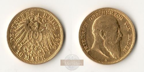 DEUTSCHES KAISERREICH. Baden, Friedrich I. 1856-1907 10 Mark 1904 G - Münzstätte Karlsruhe Gewicht: 3,99g Material: 900/1.000 Gold Feingewicht: 3,58g Erhaltung: sehr schön...
