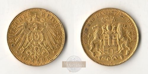 DEUTSCHES KAISERREICH. Hamburg, Freie und Hansestadt 1871-1918 10 Mark 1890 J - Münzstätte Hamburg Gewicht: 3,99g Material: 900/1.000 Gold Feingewicht: 3,58g Erhaltung: sehr sc...
