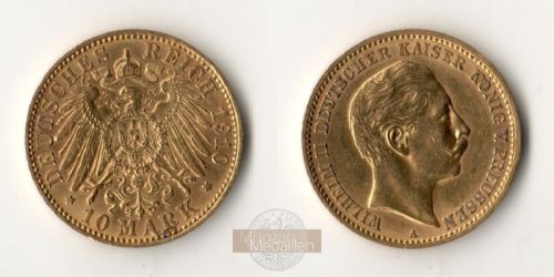 DEUTSCHES KAISERREICH. Preussen, Wilhelm II. 1888-1918 10 Mark 1910 A - Münzstätte Berlin Gewicht: 3,99g Material: 900/1.000 Gold Feingewicht: 3,58g Erhaltung: sehr schön,...