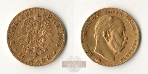 DEUTSCHES KAISERREICH. Preussen, Wilhelm I. Kaiser 1871-1888 10 Mark 1875 C - Münzstätte Frankfurt/Main Gewicht: 3,99g Material: 900/1.000 Gold Feingewicht: 3,58g Erhaltung: se...